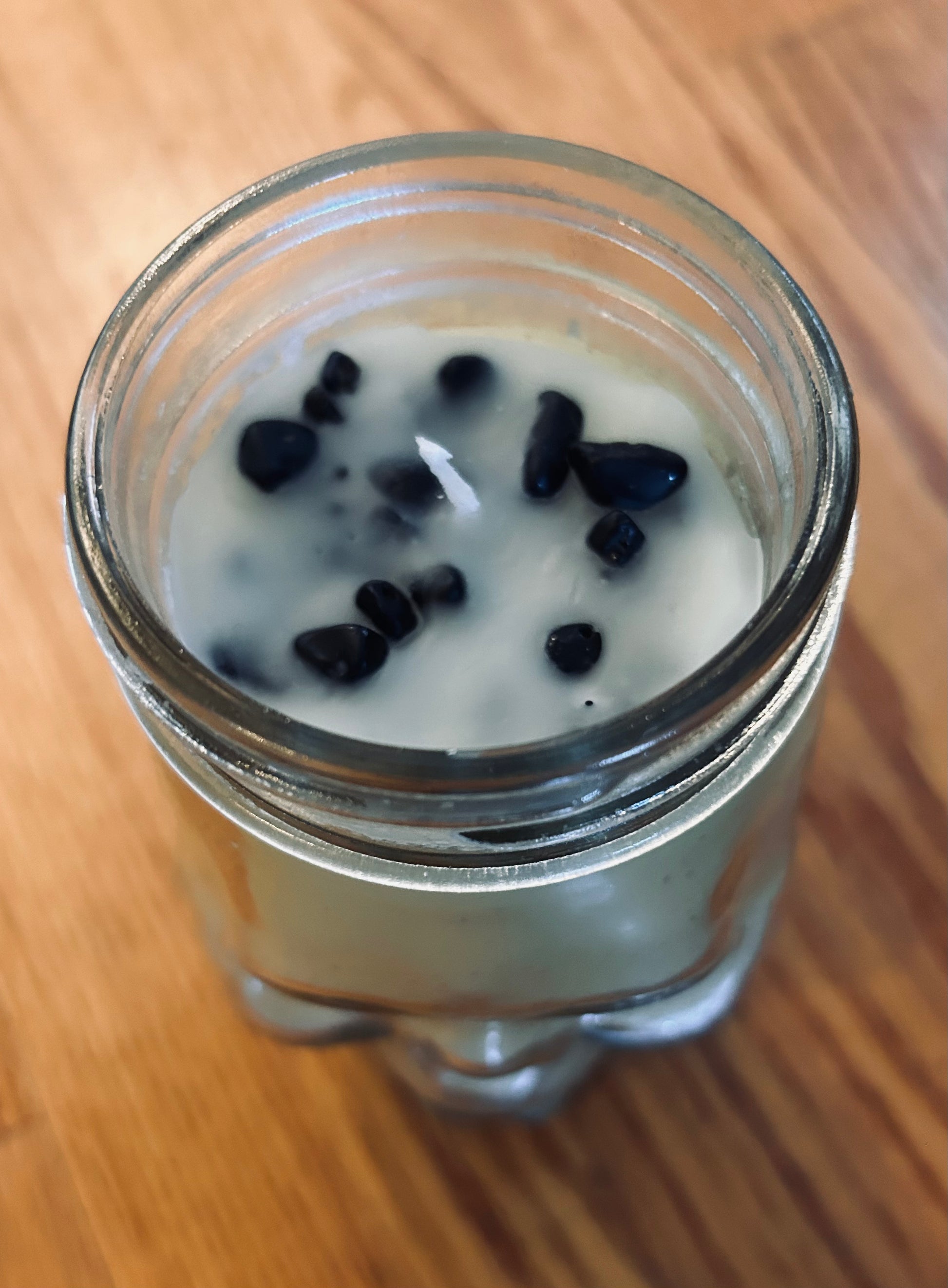This candle is hand-poured organic beeswax, lightly scented with rose essential oil, in a glass skull jar with semi-precious onyx chips. Each candle contains a manifestation and a rose quartz stone. The manifestations are written on wildflower paper, which can be planted to ensure your manifestations bloom. Keep the rose quartz for self-love. Each candle has spent time in the sun and moonlight, and are consecrated under the lunar eclipse. This candle contains the mantra, "I release past trauma"