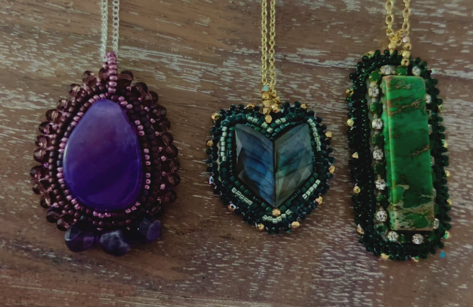 This is a rectangular green Imperial Jasper cabochon, surrounded with an antique green and crystal rhinestone banding from India. Edged with green Charlotte cut glass beads and 24k gold plated fire polished beads. Backed with gold deer hide from the Rama Pow Wow. Chain is 14k gold plated