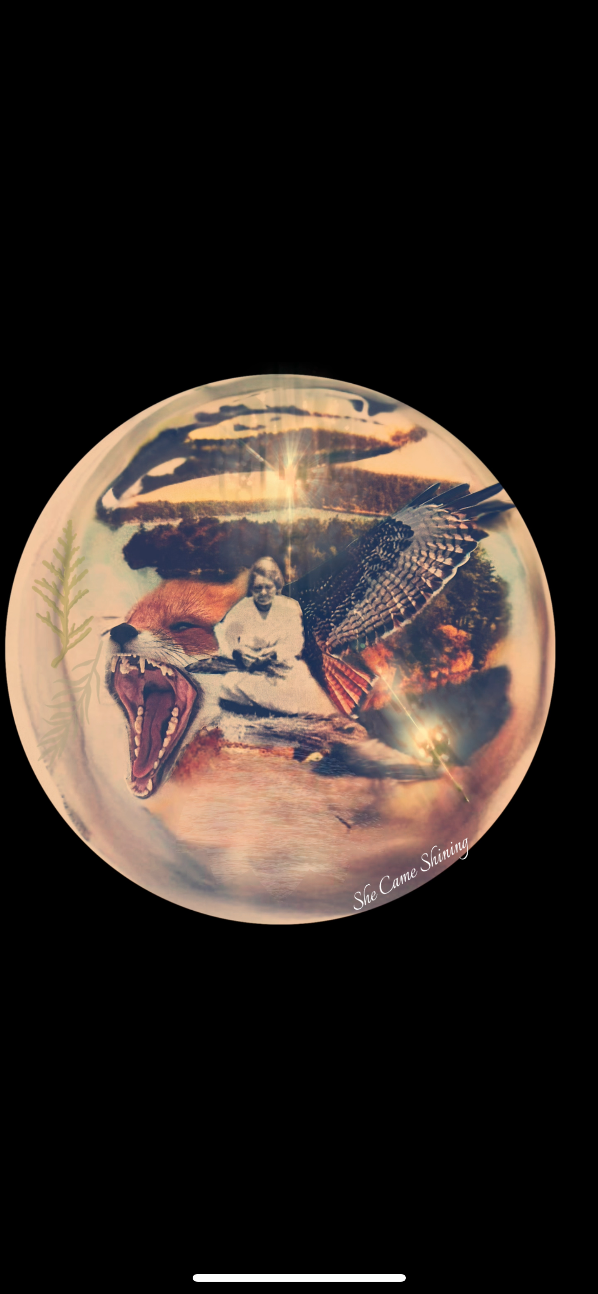 "Maggie Jack" is a mixed media piece celebrating Maggie Jack, a Medicine Woman and Shapeshifter from the Artist's community, Georgina Island First Nation
