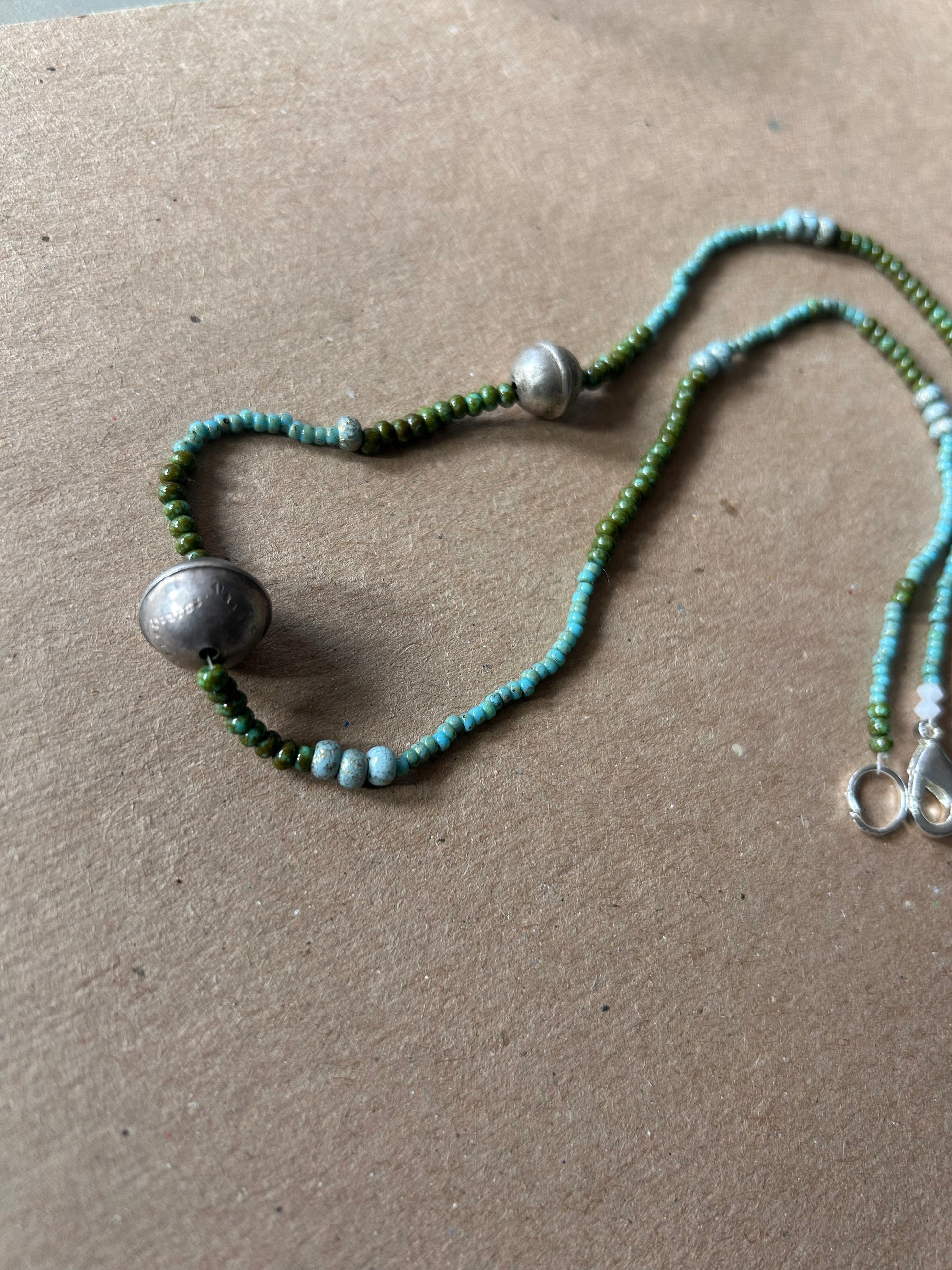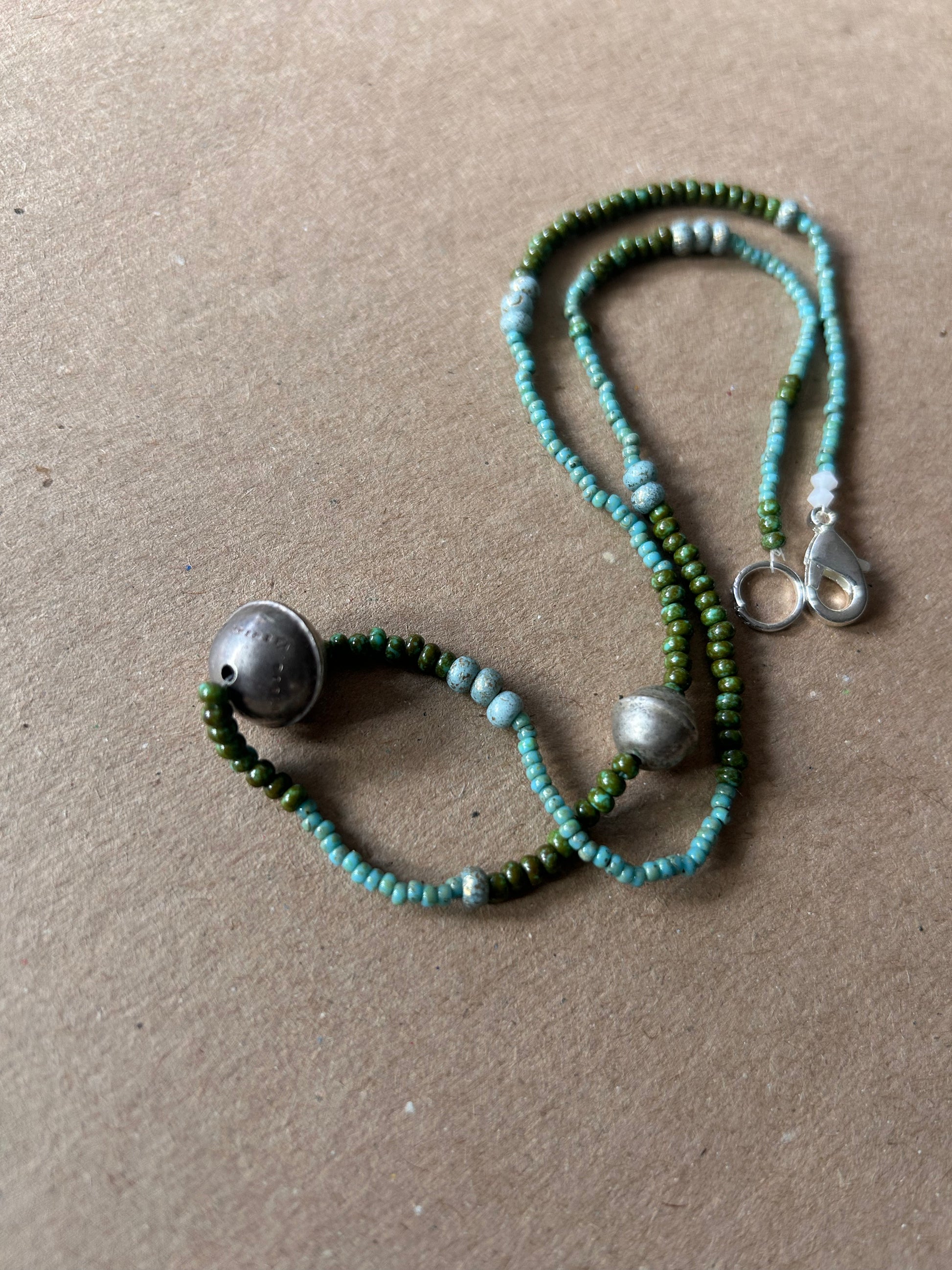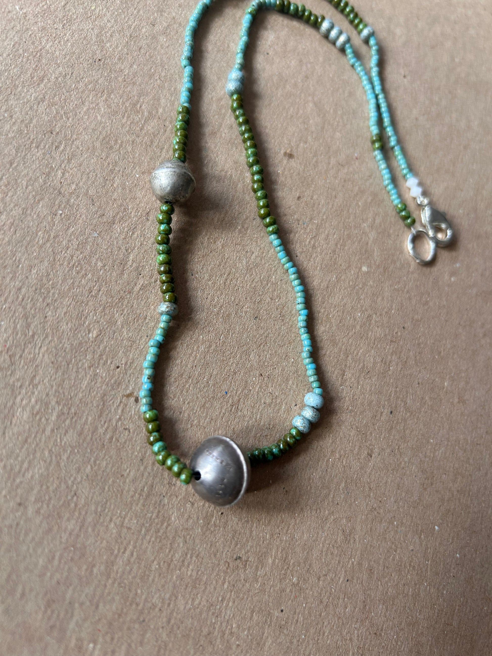 This necklace features various green seed beads with two authentic vintage Navajo "pearls" which are silver stamped hollow beads.