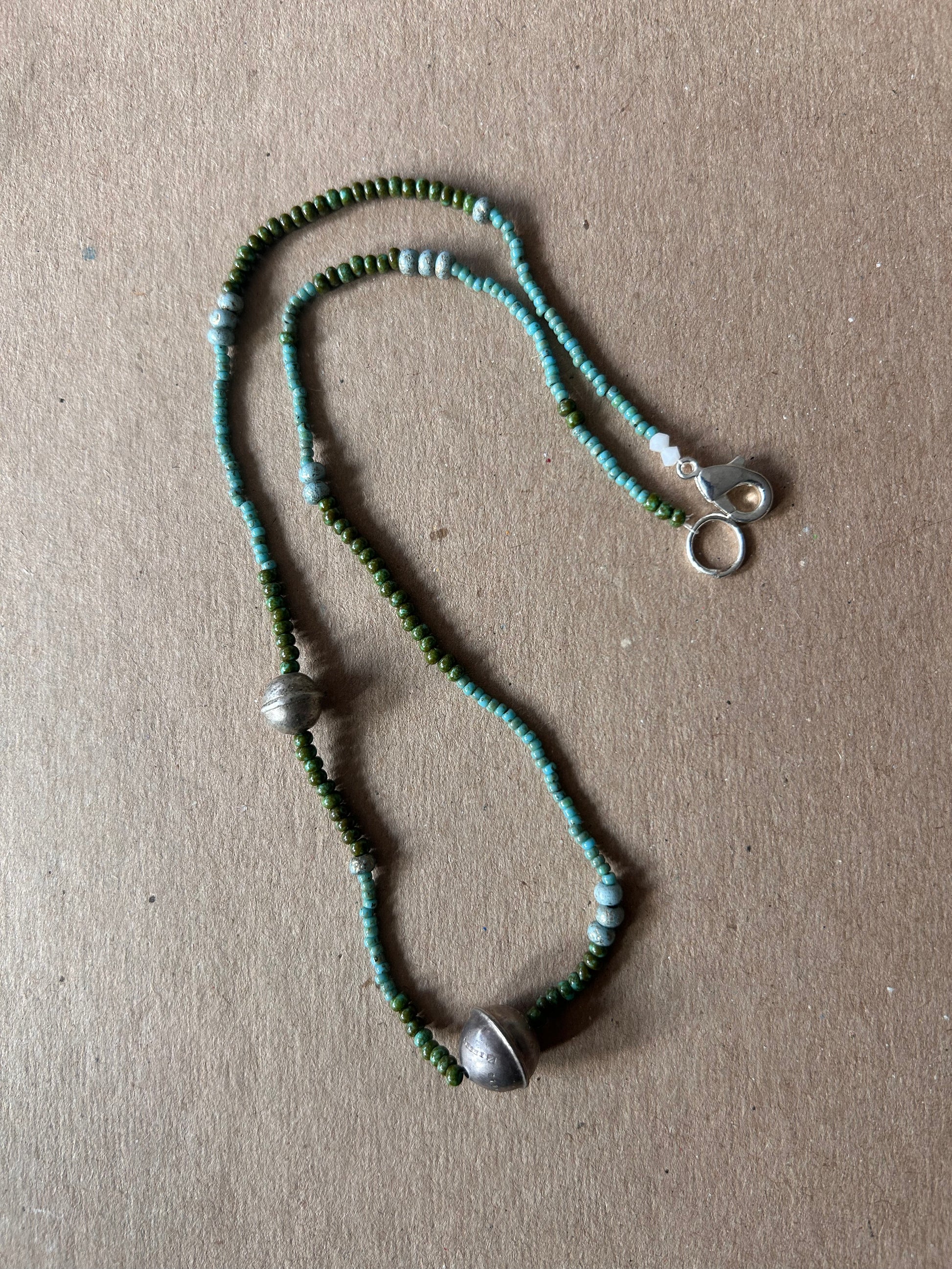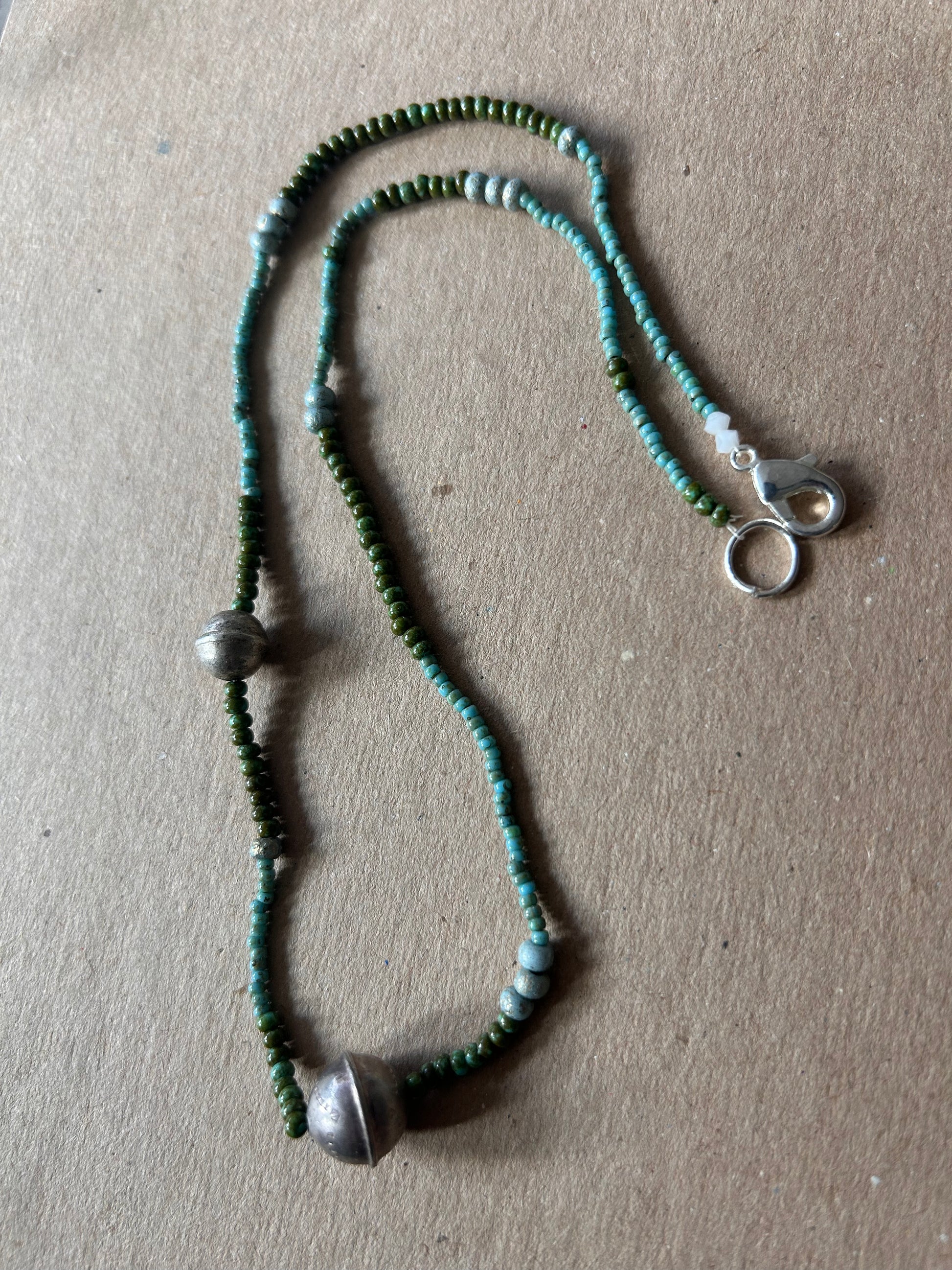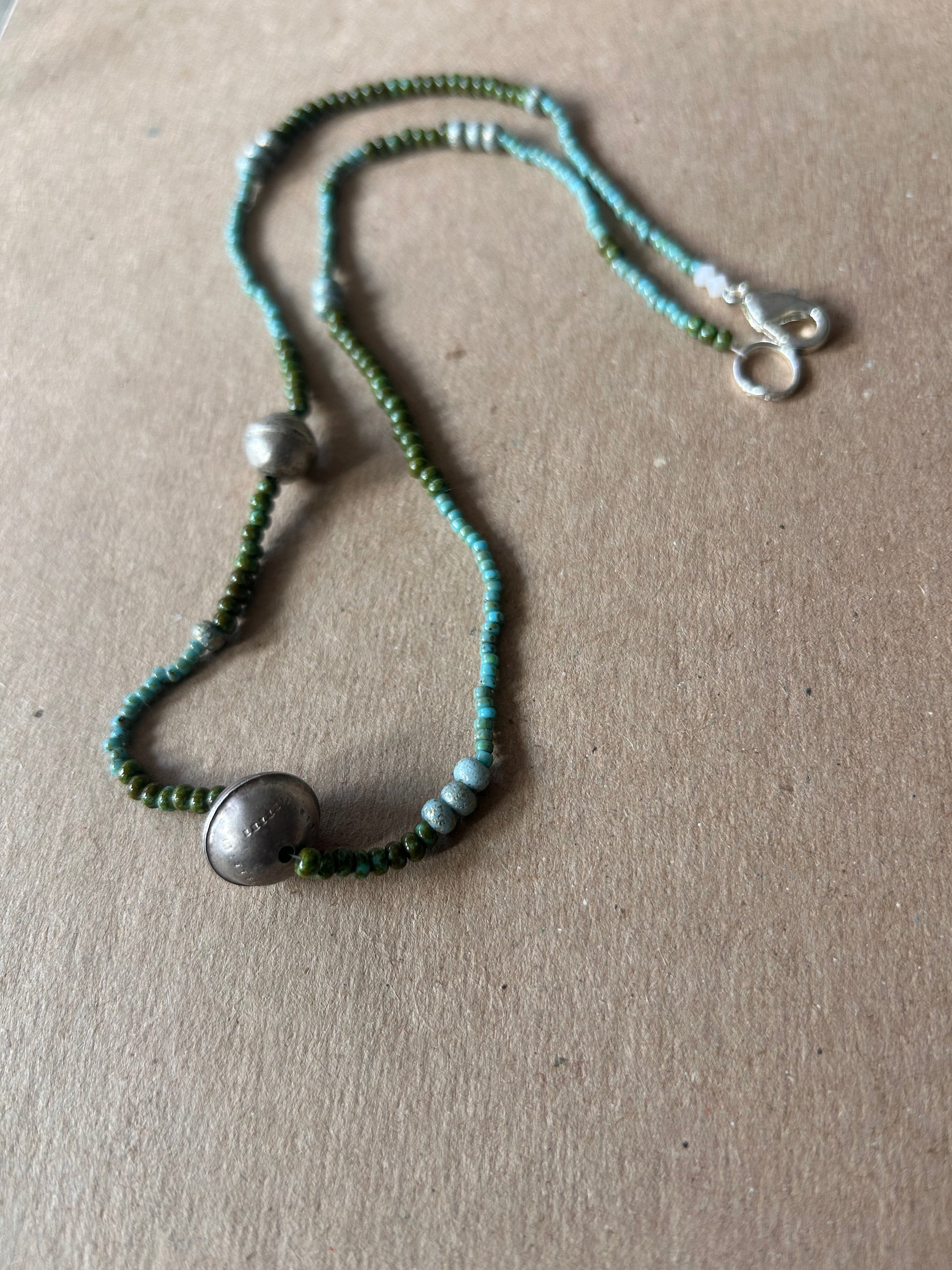 This necklace features various green seed beads with two authentic vintage Navajo "pearls" which are silver stamped hollow beads.