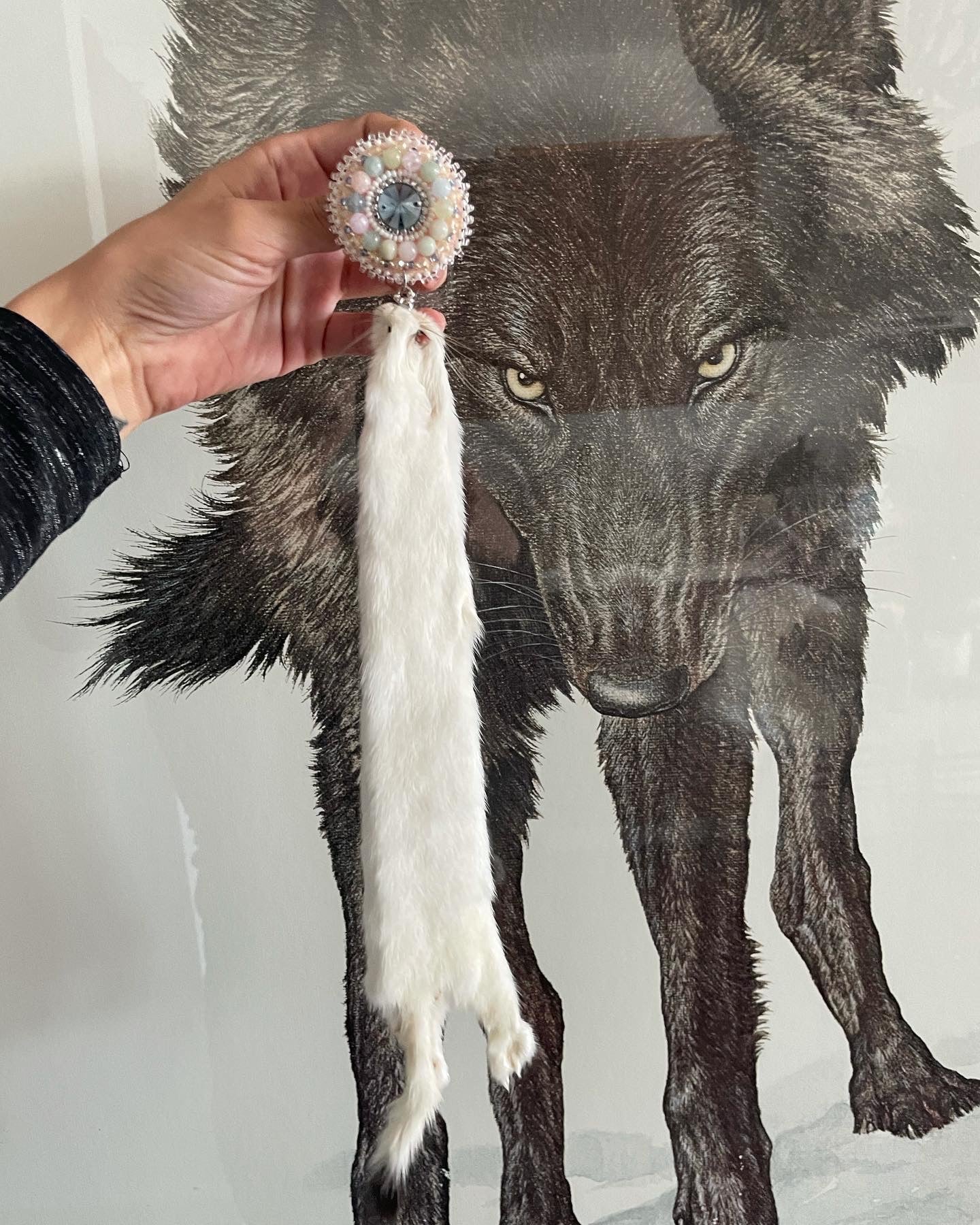 These earrings feature ice blue Swarovski crystals, surrounded by pastel morganites and fire polished bicones. Backed with deer hide and featuring two full removable ermine pelts.