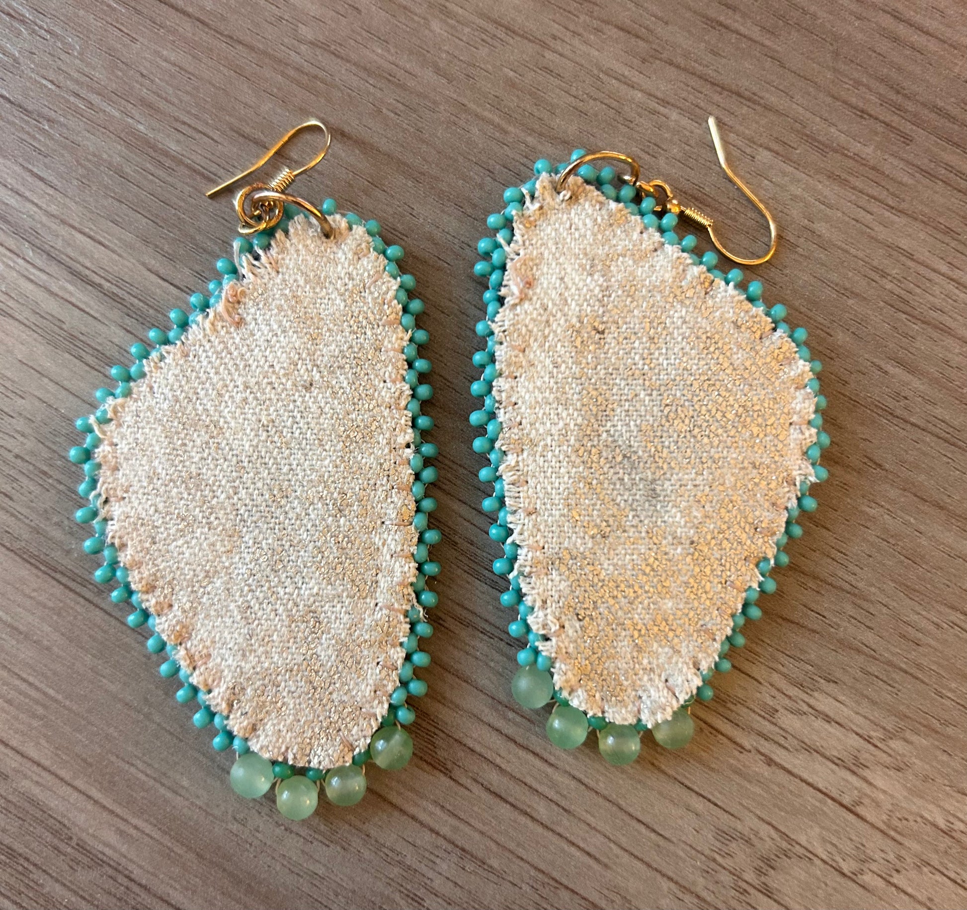 Vegan! Paper printed butterfly wings surrounded by blue and green seed beads, and genuine aventurine beads. Aventurine encourages emotional healing and self-love, helping to bring harmony and balance to the heart. Backed with gold embossed linen and finished with 14k gold plated ear hooks