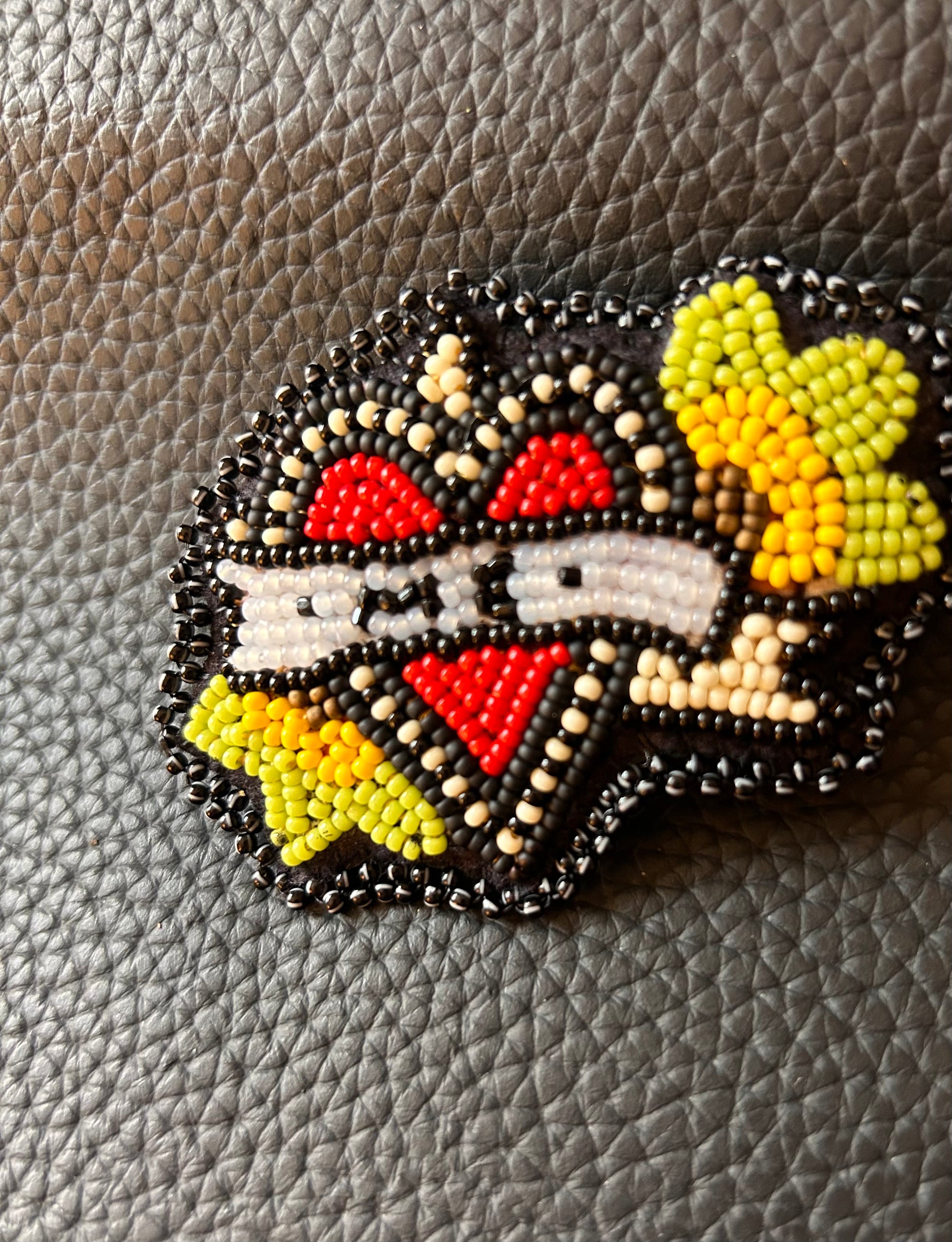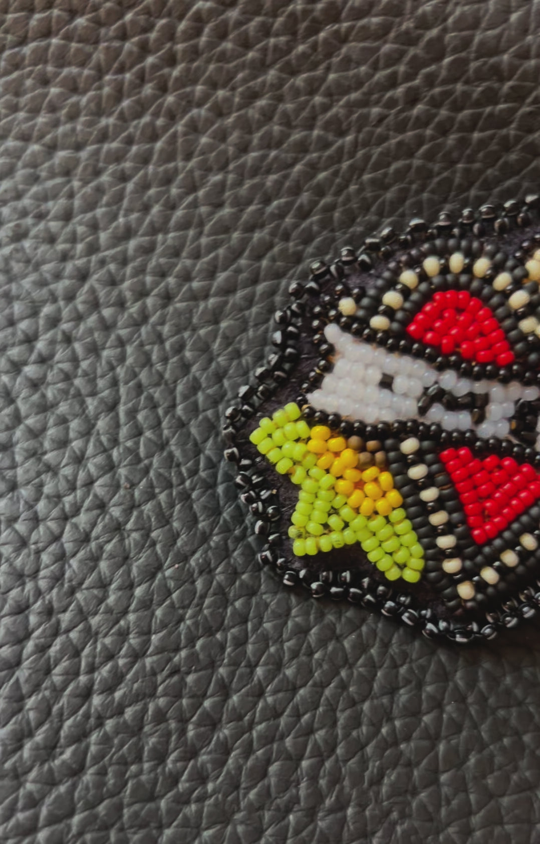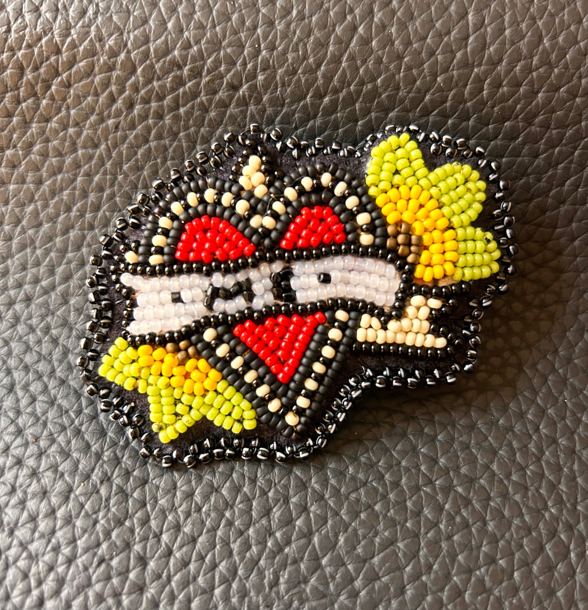 This is a traditional tattoo-style heart with yellow flowers and a banner reading "ME" to show self-love <3 Backed with vegan leather and two gold-coloured metal butterly pins.