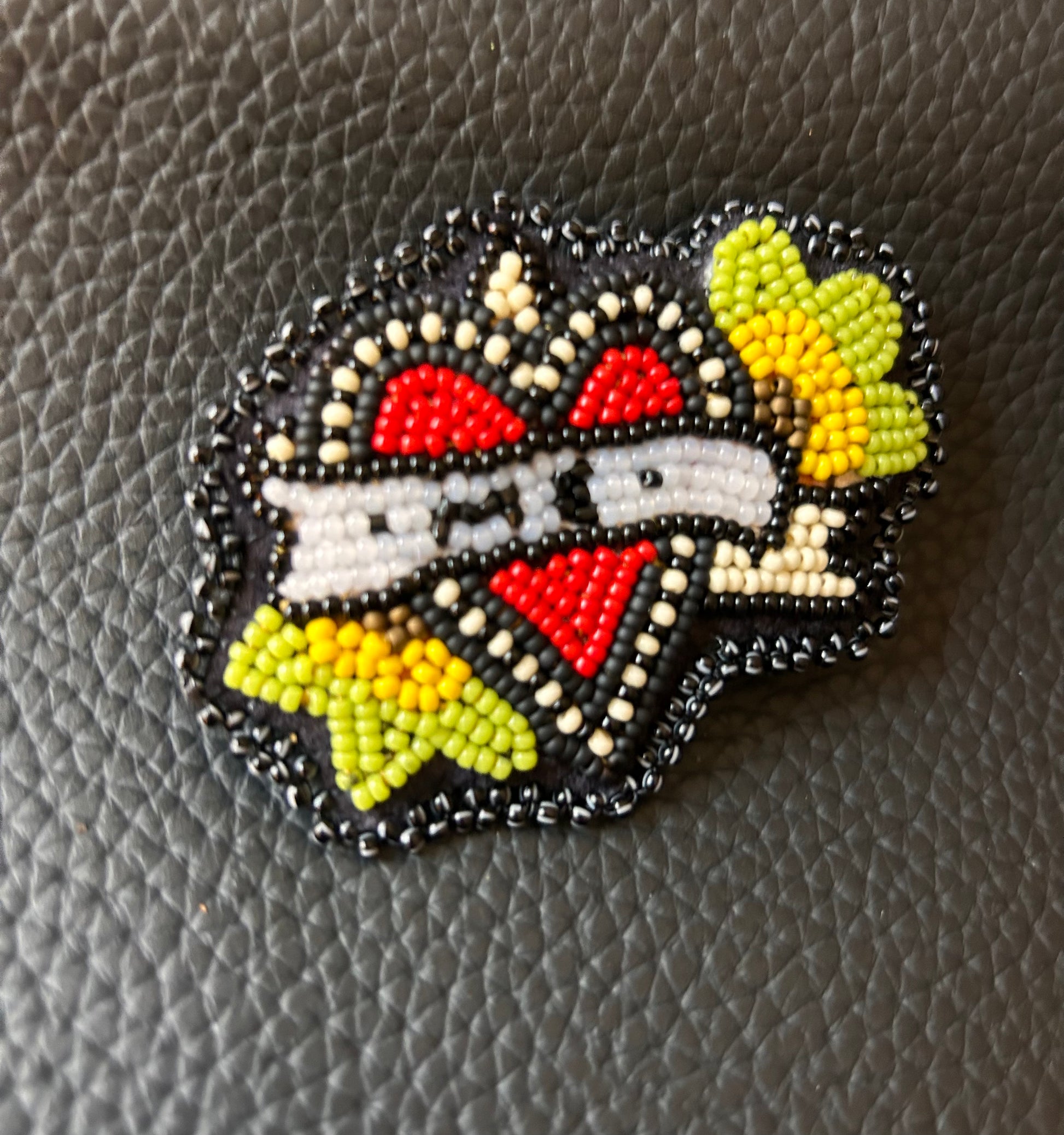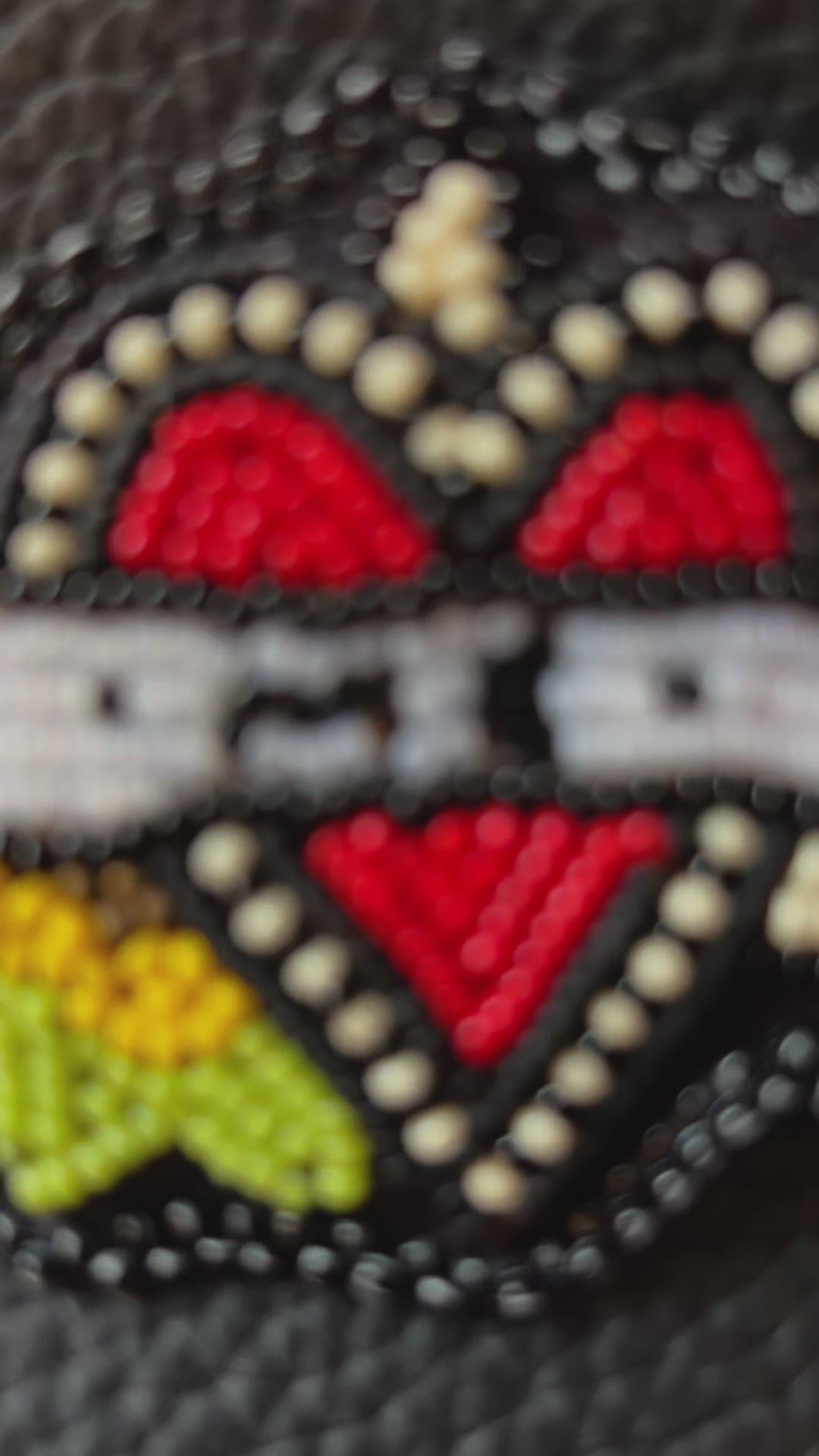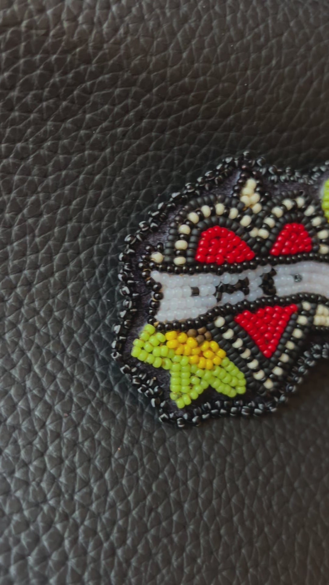 This is a traditional tattoo-style heart with yellow flowers and a banner reading "ME" to show self-love <3 Backed with vegan leather and two gold-coloured metal butterly pins.