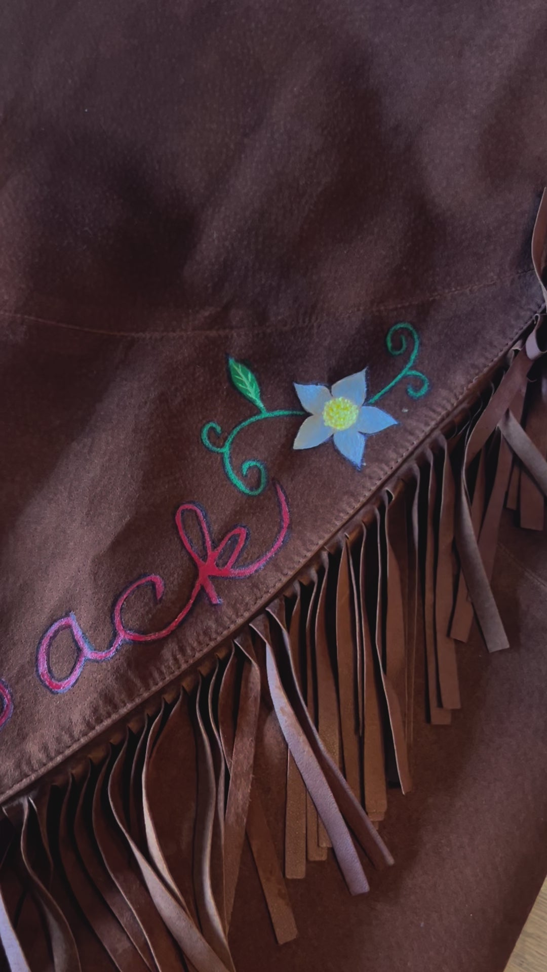 Vintage upcycled suede fringe skirt with hand-painted "Land Back" with strawberry and flower. Size 12- 30" waist