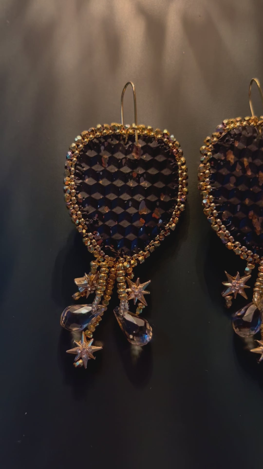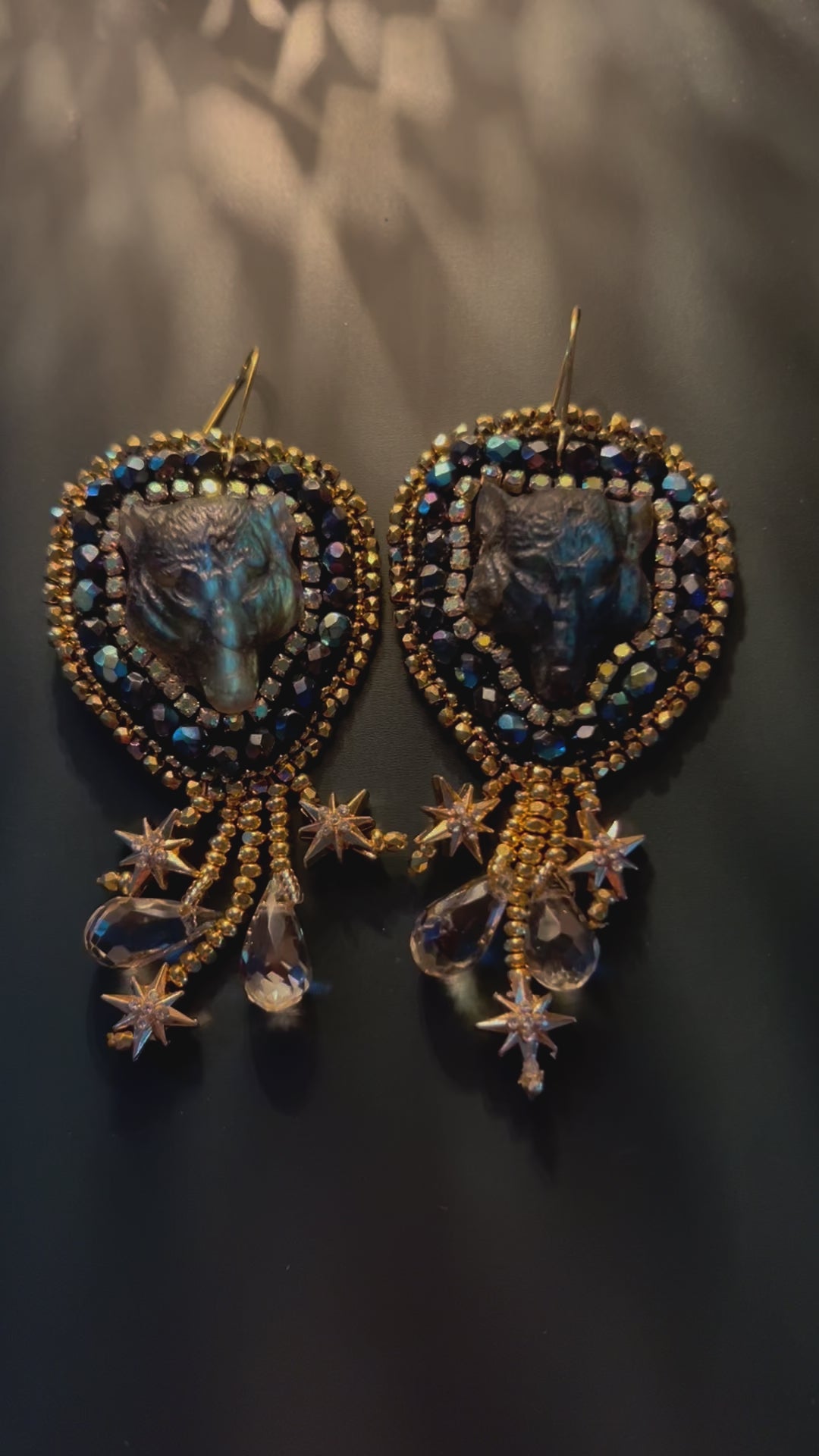 These earrings feature labradorite wolf heads, surrounded by 24k gold plated crystal rhinestone banding, fire polished black and blue iridescent faceted beads. Edged with 24k gold preciosa beads and fire polished 24k gold shimmer beads. Backed with vegan leather. Features 24k gold preciosa bead dangles with northstar crystals and Swarovski crystal teardrops. Earrings have 24k gold plated ear hooks.