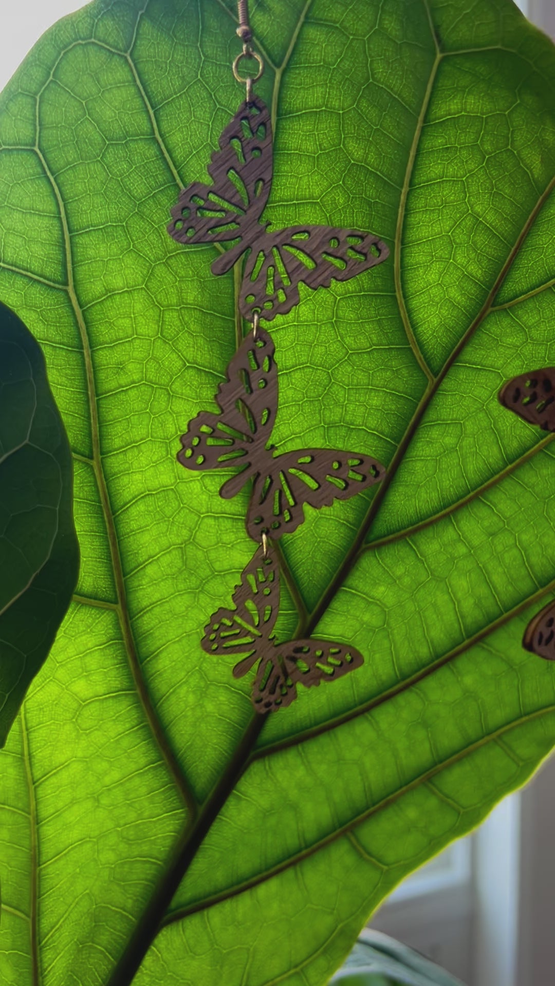 Three feather light wooden butterflies with 14k gold plated ear hooks